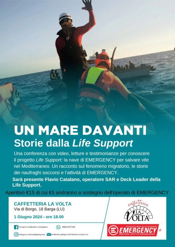 La serata si svolgerà presso la Caffetteria La Volta, in Via di Borgo 18 a Barga, iniziando con la proiezione di un breve filmato descrittivo del progetto Life Support di Emergency, la nave adibita al soccorso dei migranti nel Mediterraneo. Parte centrale dell’evento sarà la testimonianza di Flavio Catalano, operatore Search and Rescue e Deck Leader della nave, il quale riporterà la sua esperienza diretta delle varie missioni svolte a bordo della Life Support.