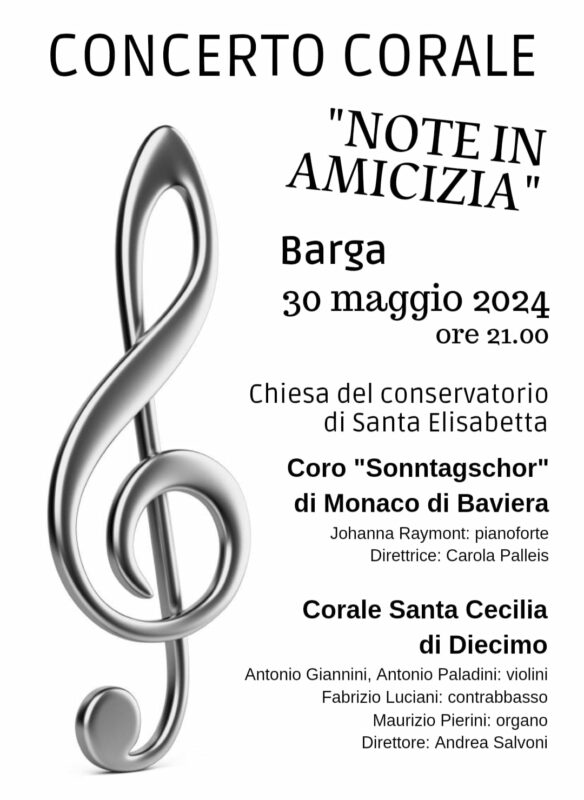 BARGA – “Note in amicizia” si intitola così il concerto corale che si terrà a Barga il 30 maggio alle ore 21 presso la chiesa del Conservatorio Santa Elisabetta, nel centro storico.
