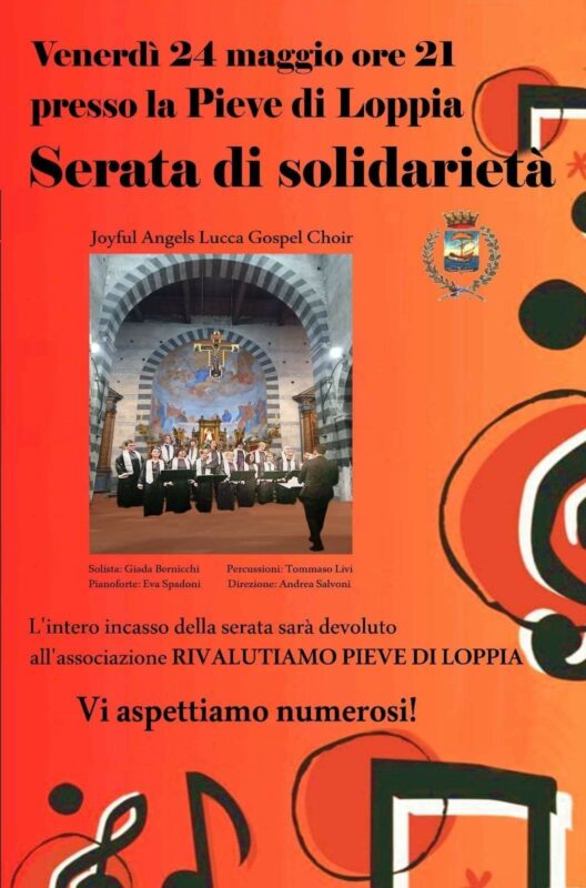 LOPPIA – Stasera, venerdì 24 maggio nella Pieve di Loppia una serata di solidarietà in musica, con la partecipazione del Joyful Angelos Gospel Choir di Lucca. L’intero incasso della serata servirà per finanziare i lavori di restauro e ristrutturazione dell’antica pieve romanica di Loppia.