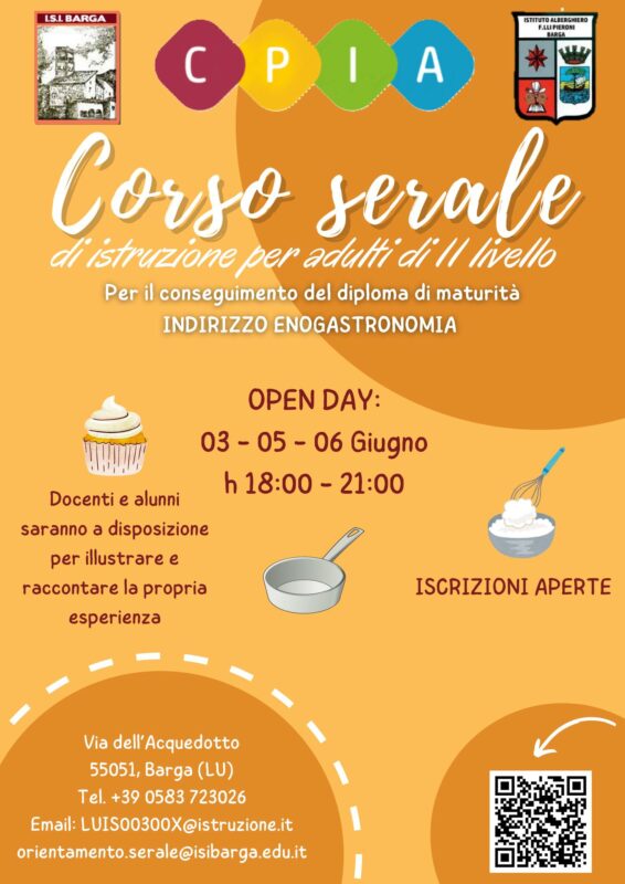 L’open day, anzi gli open day, si terranno il 3, il 5 ed il 6 giugno dalle 18 alle 21 presso l’ISI Barga in via dell’Acquedotto. Gli interessati troveranno a loro disposizione docenti ed alunni del corso serale per presentare la propria esperienza.