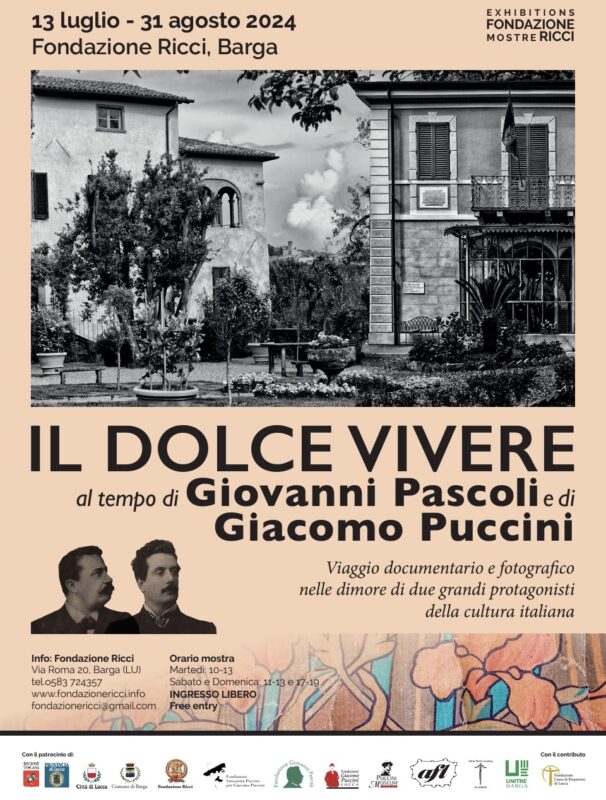La Fondazione Ricci in collaborazione con la Fondazione Giovanni Pascoli di Barga, il Comune di Barga, la Fondazione Simonetta Puccini per Giacomo Puccini di Torre del Lago, con l’Archivio Fotografico Lucchese e l’Istituto Storico Lucchese sezione di Barga, con il patrocinio della Regione Toscana e della Provincia di Lucca, e tra gli altri del Puccini Museum e di Unitre Barga e con il contributo della Fondazione Cassa di Risparmio di Lucca, presenta questa mostra che grazie ai materiali conservati nell’Archivio Pascoli di Castelvecchio a Barga, Archivio Fondazione Simonetta Puccini per Giacomo Puccini di Torre del Lago, Archivio Fotografico Lucchese e in parte provenienti da fondi privati, saranno esposti a Barga: documenti, fotografie, oggetti e fotografie artistiche che creeranno a un percorso originale e affascinante che permetterà al visitatore di osservare i luoghi e le dimore del poeta Giovanni Pascoli e del celebre compositore Giacomo Puccini.
