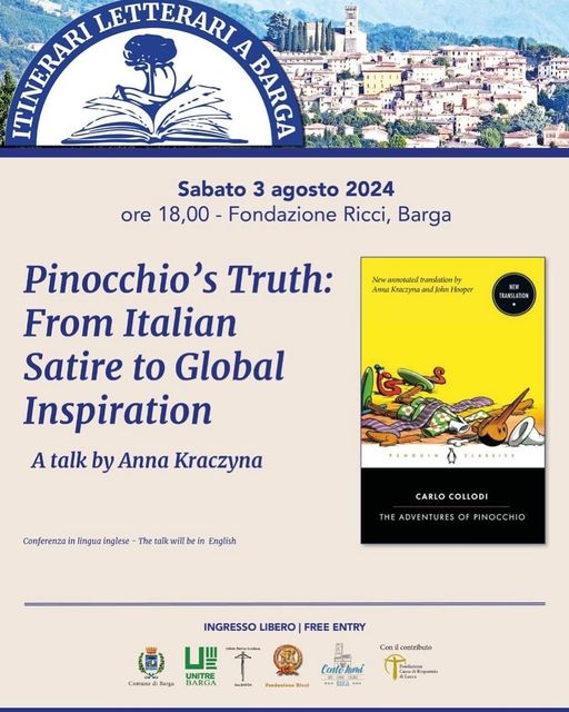 BARGA – Sabato 3 agosto riprendono gli Itinerari letterari promossi in collaborazione tra Fondazione Ricci ETS, Comune di Barga, Unitre Barga, Istituto Storico Lucchese sez. Barga e Cento Lumi. Il primo appuntamento del 2024, presso la sede della Fondazione Ricci (via Roma 20, Barga) alle ore 18.00 vedrà come relatrice Anna Kraczyna che parlerà del tema “La Verità di Pinocchio. Da satira sull’Italia a ispirazione globale”.