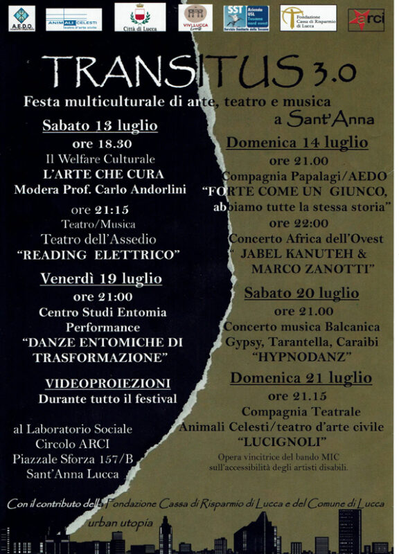 LUCCA – Nei prossimi due fine settimana, il 13-14 e 20-21 luglio, torna Transitus 3.0, il festival che ridisegna il tessuto teatrale a S. Anna a Lucca. L’appuntamento, giunto alla 3^ edizione e che rientra nel progetto “Cantiere delle Differenze”, è promosso dall’Associazione AEDO, associazione Animali Celesti/teatro d’arte civile, Circolo ARCI Laboratorio Sociale Piazzale Sforza, con il contributo della Fondazione CRL, Comune di Lucca, SAI, Liberalabor, Arci Toscana, Cooperativa sociale Odissea, ASL Toscana Nord Ovest, MIC, Regione Toscana; molti partner che testimoniano l’impegno collettivo nella volontà di socializzare e contemporaneamente riqualificare culturalmente il quartiere di S. Anna, coinvolgendo gli stessi residenti ma anche i turisti; proponendo una esperienza il cui fine è quello tramite l’inclusione sociale e forme artistiche, creare un presidio urbano d’arte e cultura; quest’anno a Sant’Anna e nei prossimi anni anche nei quartieri limitrofi di Lucca.