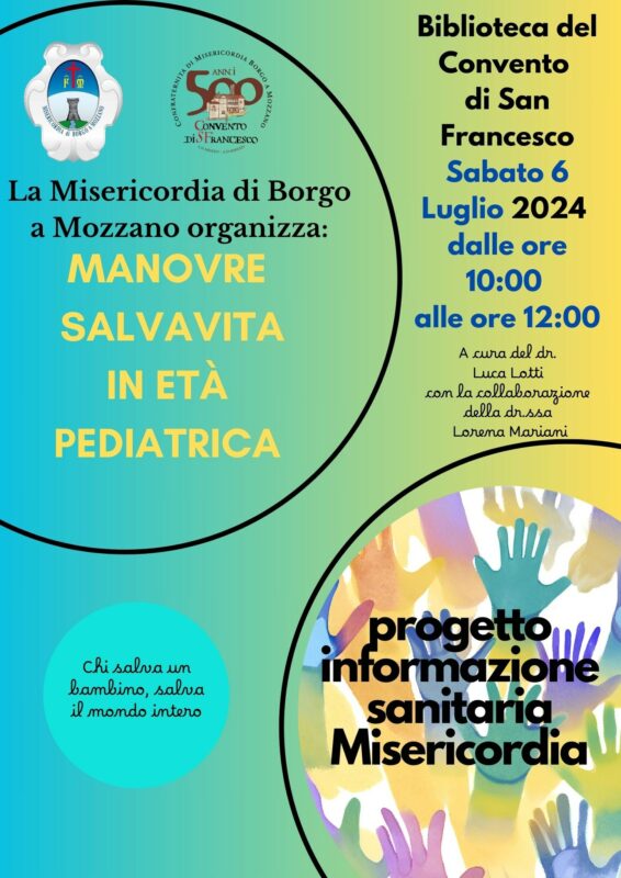 BORGO A MOZZANO – La Misericordia di Borgo a Mozzano, da sempre, è attiva sul territorio e mette al servizio della comunità le proprie conoscenze e strutture. E’ nello splendido ed accogliente scenario del giardino della RSA Convento San Francesco che la Confraternita organizza una nuova iniziativa nell’ambito del progetto di informazione sanitaria. Sabato 6 luglio dalle 10 alle 12 presso la biblioteca sarà organizzato un incontro di formazione – informazione sul tema “Manovre salvavita in età pediatrica”. Il corso sarà svolto dal dottor Luca Lotti con la collaborazione della dott.ssa Lorena Mariani ed è aperto a tutti e assolutamente gratuito.