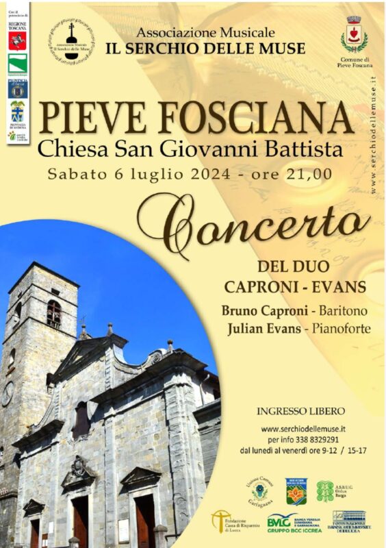 Sabato 6 luglio alle ore 21, nella Pieve di San Giovanni a Pieve Fosciana, protagonista sarà il duo Caproni-Evans composto da Bruno Caproni (baritono) e Julian Evans (pianoforte). Da Beethoven a Liszt, fino ai compositori nostrani Tosti, Giordano e Denza: una serata – ad ingresso gratuito – che si preannuncia davvero magica.