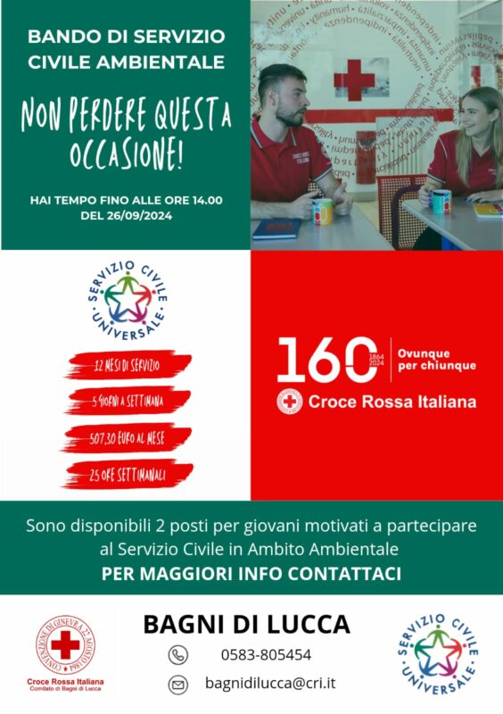 BAGNI DI LUCCA – Sono disponibili nel Comitato di Bagni di Lucca della croce Rossa Italiana due posti per giovani motivati a partecipare al Servizio Civile in ambito Ambientale.
