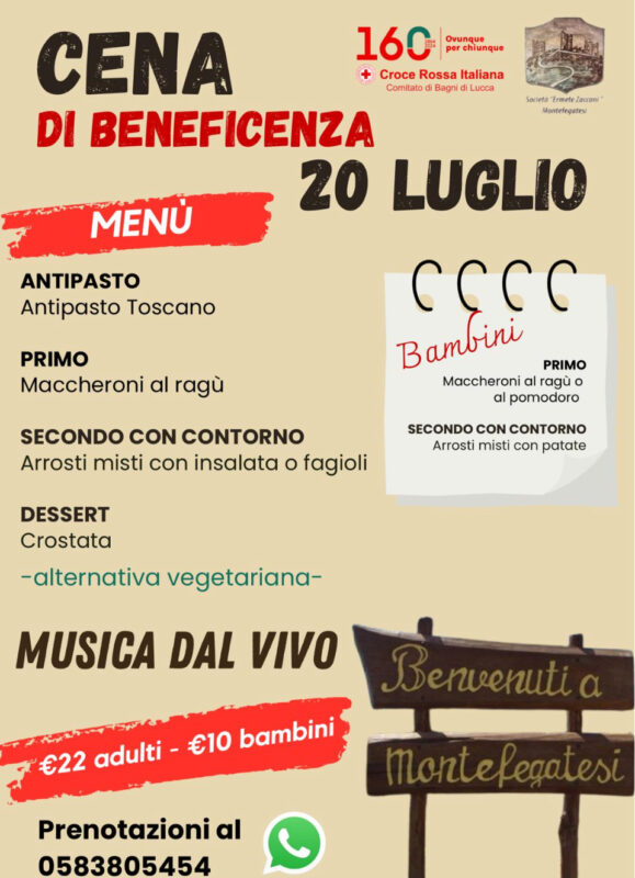 Si terrà a Montefegatesi sabato 20 luglio grazie anche alla sensibilità ed all’attenzione verso il sodalizio CRI della Società Ermete Zacconi che collabora a questa serata organizzata dedicata alla CRI e che vede impegnato lo stesso comitato termale dell’associazione.