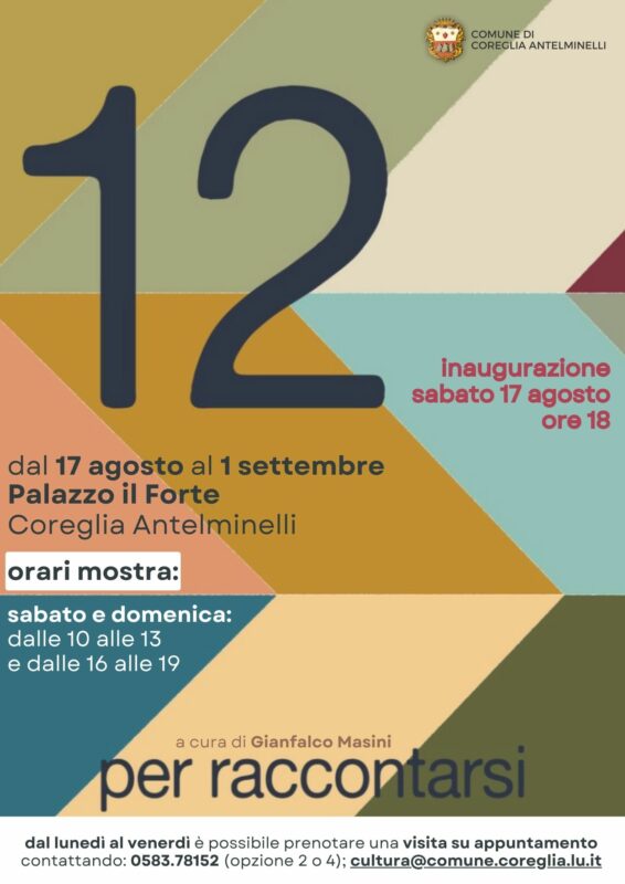 COREGLIA – Il Palazzo “ Il Forte” ospita un’altra rassegna d’arte “12 per raccontarsi”. Dodici artisti – Giovanna Ambrogi, Ardo, Michela Barsanti, Cinzio Cavallarin, Graziano Dovichi, Cesare Giovacchini, Silvia Mașini, Alessandra Morescalchi, Silvana Pianadei, David Sani, Giulia Santarini, Gianfranco Tognarelli – che si raccontano ognuno secondo il proprio linguaggio: con la scultura, con la pittura e con la fotografia. La mostra sarà inaugurata sabato 17 agosto, alle 18 a Coreglia Antelminelli, e resterà aperta fino al 1 settembre, secondo i seguenti orari: sabato e domenica dalle 10 alle 13 e dalle 16 alle 19; dal lunedì al venerdì, invece, su appuntamento chiamando il numero 0583.78152 (opzione 2 o 4) o per email a cultura@comune.coreglia.lu.it.