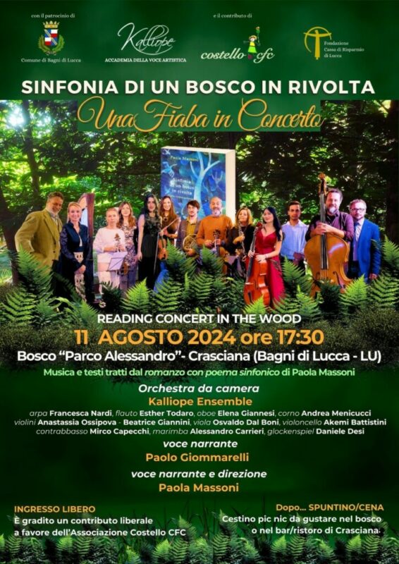 Dopo le esibizioni sulle Mura di Lucca e al teatro Artè a Capannori, la soprano Paola Massoni porta lo spettacolo tratto dal suo romanzo con poema sinfonico “Sinfonia di un bosco in rivolta” al Bosco del Parco Alessandro di Crasciana, piccolo paese arroccato sulle colline del Comune di Bagni di Lucca. L’appuntamento è domenica 11 agosto alle 17.30, per un’opera che regalerà a tutto il pubblico una serata piena di musica, teatro, sogno, natura e poesia.