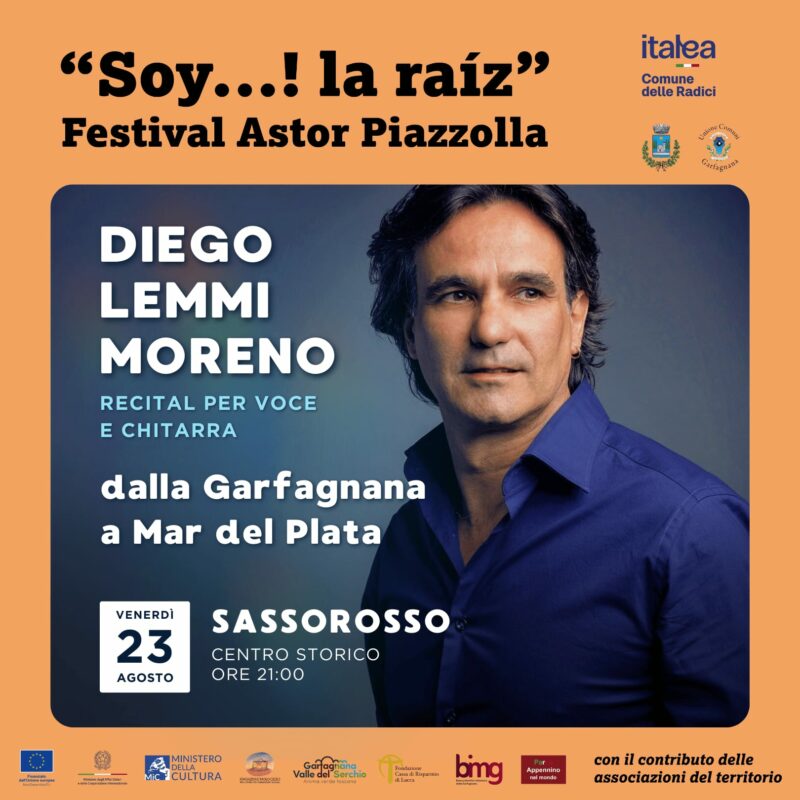 Venerdì 23 agosto, alle ore 21, si conclude il “Soy…! La raíz Festival Astor Piazzolla” nel Comune di Villa Collemandina con il recital per voce e chitarra del cantante, compositore e chitarrista con origini garfagnine Diego Lemmi Moreno, il quale si esibirà nel centro storico della suggestiva frazione di Sassorosso.