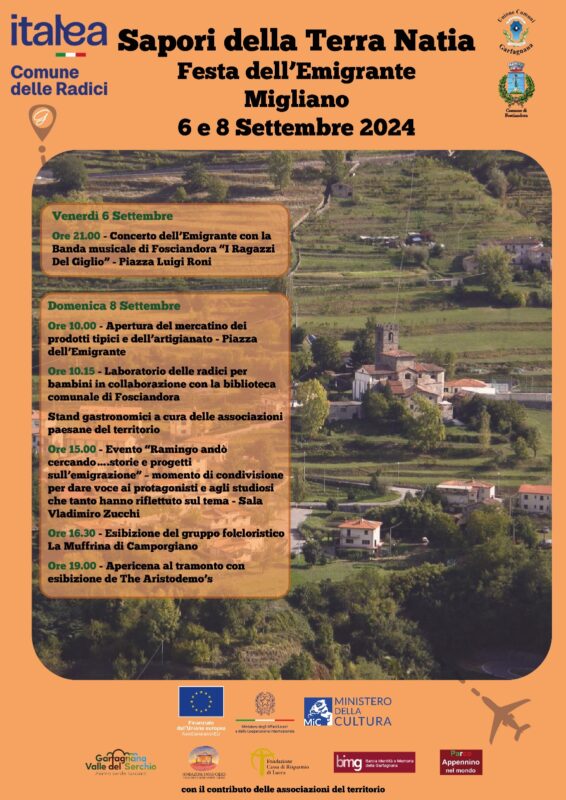 Venerdì 6 e domenica 8 settembre torna la Festa dell’Emigrante a Migliano. Un’evocativa e tradizionale iniziativa del Comune di Fosciandora – arrivata nel 2010 alla 52^ edizione, poi purtroppo interrotta – che riprende proprio nell’Anno delle radici italiane nel mondo rappresentando così un’importante occasione di incontro tra il territorio, i turisti delle radici e le comunità all’estero che tornano nei luoghi di origine nel periodo estivo.