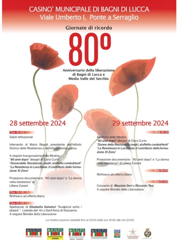 BAGNI DI LUCCA – Importante iniziativa in programma nel fine settimana a Bagni di Lucca, presso il Casinò Municipale di Ponte a Serraglio: due giorni di eventi, mostre, spettacoli, interventi per commemorare l’ottantesimo anniversario della Liberazione di Bagni di Lucca e della Mediavalle dal nazifascismo.