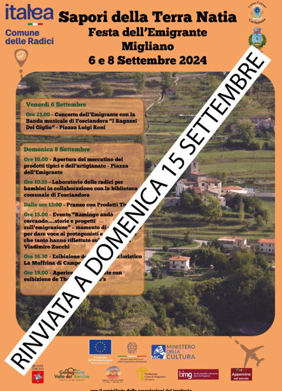GARFAGNANA – Rimandata a domenica 15 settembre – con programma invariato – la manifestazione “Sapori della Terra Natìa – Festa dell’Emigrante” a Migliano.