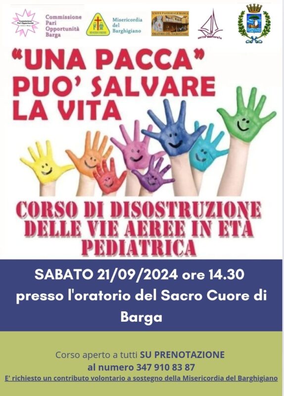 BARGA – La Commissione Pari Opportunità del Comune di Barga propone nel capoluogo sabato 21 settembre alle 14,30 l’incontro “Una pacca può salvare la vita” un corso di disostruzione delle vie aeree in età pediatrica organizzato dalla Misericordia del Barghigiano con il patrocinio del Comune e in collaborazione con l’Unità Pastorale di Barga, che ospita l’evento al oratorio del Sacro Cuore in Piangrande.