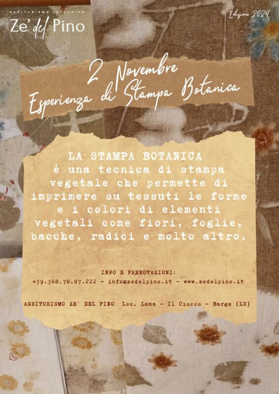 BARGA – Esperienza di stampa botanica. E’ la nuova iniziativa dell’agriturismo Ze’ del Pino i loc. Lama, sopra la tenuta del Ciocco, nel comune di Barga. Sabato 2 novembre ci sarà la possibilità di conoscere questa tecnica di stampa vegetale che permette di imprimere e riprodurre si tessuti, forme e colori di elementi vegetali quali fiori, foglie, bacche, radici e altro.