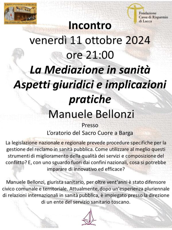 BARGA – Venerdì 11 ottobre alle 21 presso l’oratorio del Sacro Cuor si terrà un incontro con l’avv. Manuele Bellonzi per parlare del tema: “La Mediazione in sanità. Aspetti giuridici e implicazioni pratiche”.