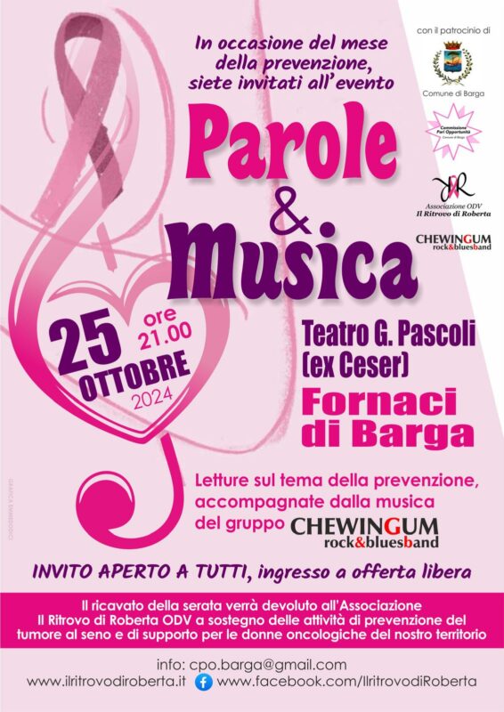 BARGA – In occasione del mese della prevenzione contro il tumore al seno, la Commissione Pari Opportunità e il Comune di Barga in collaborazione con l’associazione “Il Ritrovo di Roberta” e il gruppo musicale Chewingum Rock & Blues Band, presentano lo spettacolo di sensibilizzazione “Parole e Musica”.
