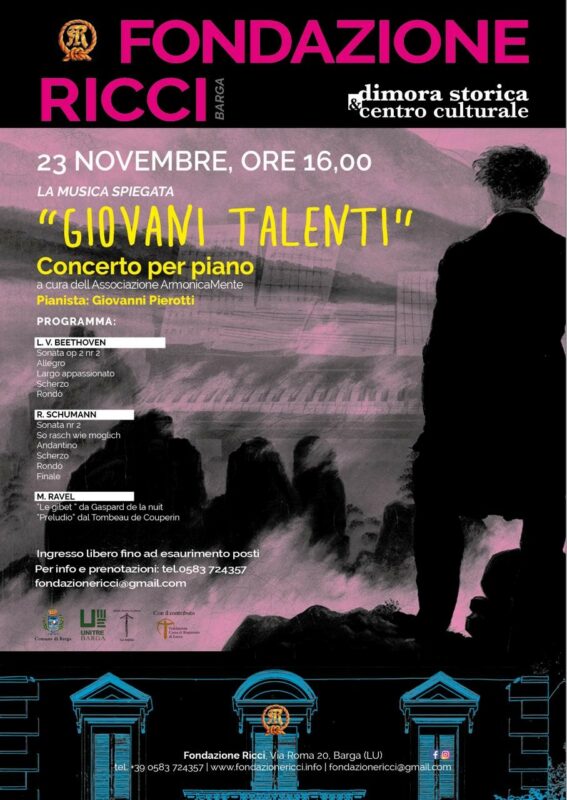 BARGA – Sabato 23 novembre alle ore 16 si terrà alla Fondazione Ricci di Barga il primo dei concerti di musica classica della rassegna musicale “Giovani talenti” italiani a cura dell’Associazione ArmonicaMente; parteciperà il giovane pianista Giovanni Pierotti.