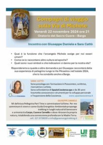 A proposito di Oratorio, venerdì 22 novembre alle 21 ci sarà un incontro con Giuseppe Daniele, che si definisce un camminatore full time e Sara Cattò, psicologa e scrittrice, sul tema “Compagni di viaggio, sulla via di Michele”. Un momento di riflessione e conoscenza per scoprire quale è la funzione che l’Arcangelo Gabriele svolge per gli esseri umani; come lo raccontano le culture ed epoche; quali sono i suoi simboli e che indicazioni danno per la vita di oggi.