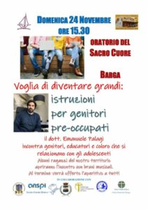 Domenica 24 novembre alle 15,30 sempre per iniziativa dell’Unità Pastorale, del Circolo ANSPI Sacro Cuore Barga e con il patrocinio di Comune di Bargfa. GVS Barga, Fondazione CRL, si terrà l’incontro “Voglia di diventare grandi. Istruzioni per i genitori pre-occupati” con relatore il dottor Emanuele Palagi. L’incontro è rivolto a genitori, educatori ed a coloro che si relazionano con il mondo degli adolescenti. Alcuni ragazzi barghigiani apriranno il pomeriggio con una scelta di brani musicali.