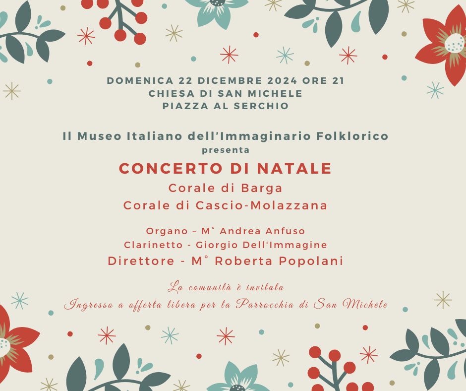 PIAZZA AL SERCHIO – Per un saluto alla comunità e lo scambio di auguri natalizi, il Museo Italiano dell’Immaginario Folklorico organizza, domenica 22 dicembre alle ore 21 presso la Chiesa di San Michele (Piazza al Serchio), il Concerto di Natale con la Corale di Barga e la Corale di Cascio-Molazzana, Direttore il M° Roberta Popolani, all’organo il M° Andrea Anfuso e al clarinetto Giorgio Dell’Immagine.