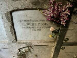 Giunti in Toscana il tempo si era mosso al brutto, con pioggia, che comunque non scoraggiò nessuno e a ogni stazione molta gente aspettava con i suoi fiori, simile a Bologna, gettai da tante finestre sul feretro. A Lucca una numerosa e mestissima folla attese il passaggio, poi l’avvio verso Castelvecchio, però, per il brutto tempo, fu deciso l’arrivo alla stazione di Fornaci di Barga, nel mezzo le note della Marcia funebre di Chopin intonata da due bande alla stazione intermedia di Bagni di Lucca.