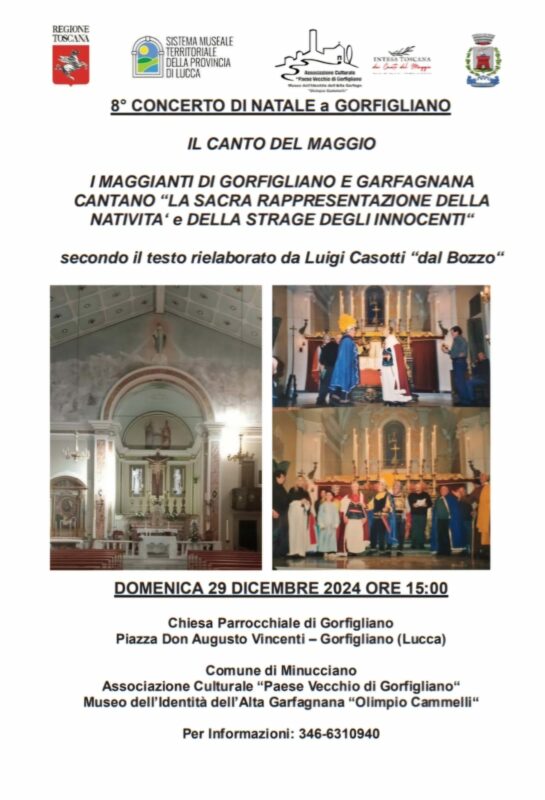 GORFIGLIANO – Un maggio inascoltato per 20 lunghi anni. Torna dal silenzio il maggio natalizio secondo il testo rielaborato da Luigi Casotti “dal Bozzo”. La “Sacra rappresentazione della natività e della strage degli innocenti” va in scenadomenica 29 dicembre alle 15 nella chiesa parrocchiale di Gorfigliano (piazza don Augusto Vincenti), interpretato dai Maggianti di Gorfigliano e della Garfagnana in occasione delle festività natalizie, ed è un’occasione unica per riascoltare la melodia e il canto che rappresenta storia, memoria e identità del territorio.