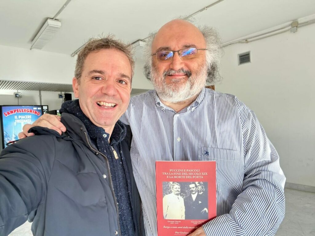 GENOVA – Questa foto è stata scattata in questi giorni presso il prestigioso Teatro Carlo Felice di Genova, dove Massimo Salotti che da qualche mese collabora con la produzione artistica del teatro, ha consegnato il libro di Pier Giuliano Cecchi su Puccini Pascoli al direttore Simone Ori. Quando ha saputo dell’esistenza di questo volume è stato lo stesso M.o Ori a richiedere a Massimo di averne una copia. Ovviamente inviata con particolare piacere e con tanto di dedica dal nostro Pier Giuliano.