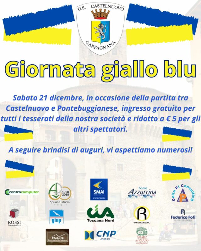 CASTELNUOVO – L’U.S. Castelnuovo, in occasione dell’anticipo di campionato di sabato 21 dicembre contro il Pontebuggianese, invita tutti i tesserati e tutti gli sportivi allo stadio Nardini per sostenere i gialloblu. Per la gara, che inizierà alle 14,30, è stata indetta la “Giornata Gialloblu”, con ingresso gratuito per tutti i tesserati e prezzo speciale di €5,00 per tutti gli altri spettatori.