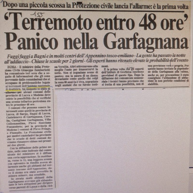 “La Protezione civile, a seguito delle informazioni pervenute dalla sezione sismica della Commissione grandi rischi del Dipartimento e dall’Istituto nazionale di geofisica, ha disposto lo stato di allerta per alcuni comuni della provincia di Lucca e Modena ove esiste la possibilità che si verifichi una scossa tellurica pericolosa entro le prossime 48 ore. I comuni che possono essere interessati sono Barga, Bagni di Lucca, Castelnuovo Garfagnana, Coreglia Antelminelli, Castiglione Garfagnana, Villa Collemandina, Pieve Fosciana e Fosciandora”.