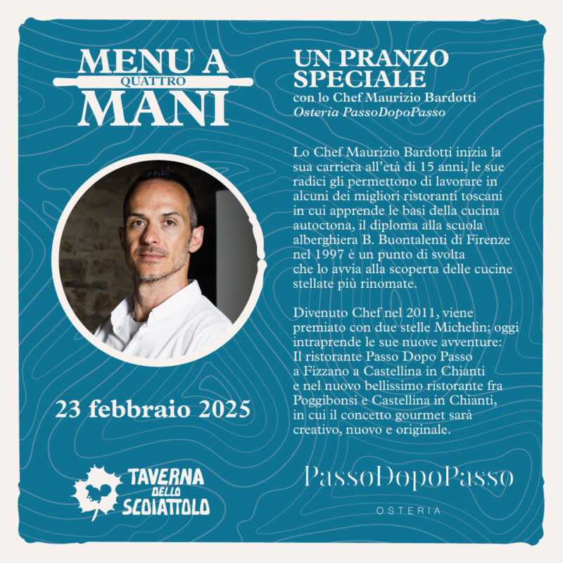 Prossimo appuntamento domenica 23 febbraio alle 13 con lo Chef ospite Maurizio Bardotti patron dell’Osteria PassoDopoPasso, di Castellina in Chianti (SI), per un pranzo dedicato ai sapori toscani.
