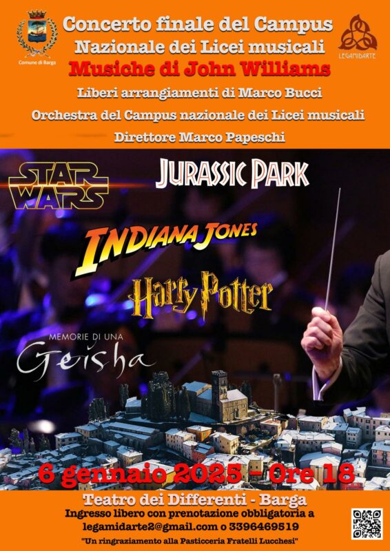Oggi 6 gennaio, alle 18, un bel momento in musica ispirato alle colonne sonore di alcuni film di successo, da Star Wars a Indiana Jones, da Harry Potter a Jurassic Park, ovvero le musiche di John Williams con i liberi arrangiamenti di Marco Bucci. Il tutto proposto dall’orchestra del Campus Nazionale dei Licei Musicali diretto da Marco Papeschi.