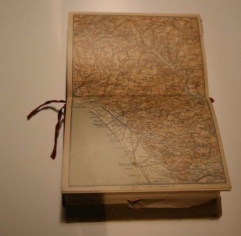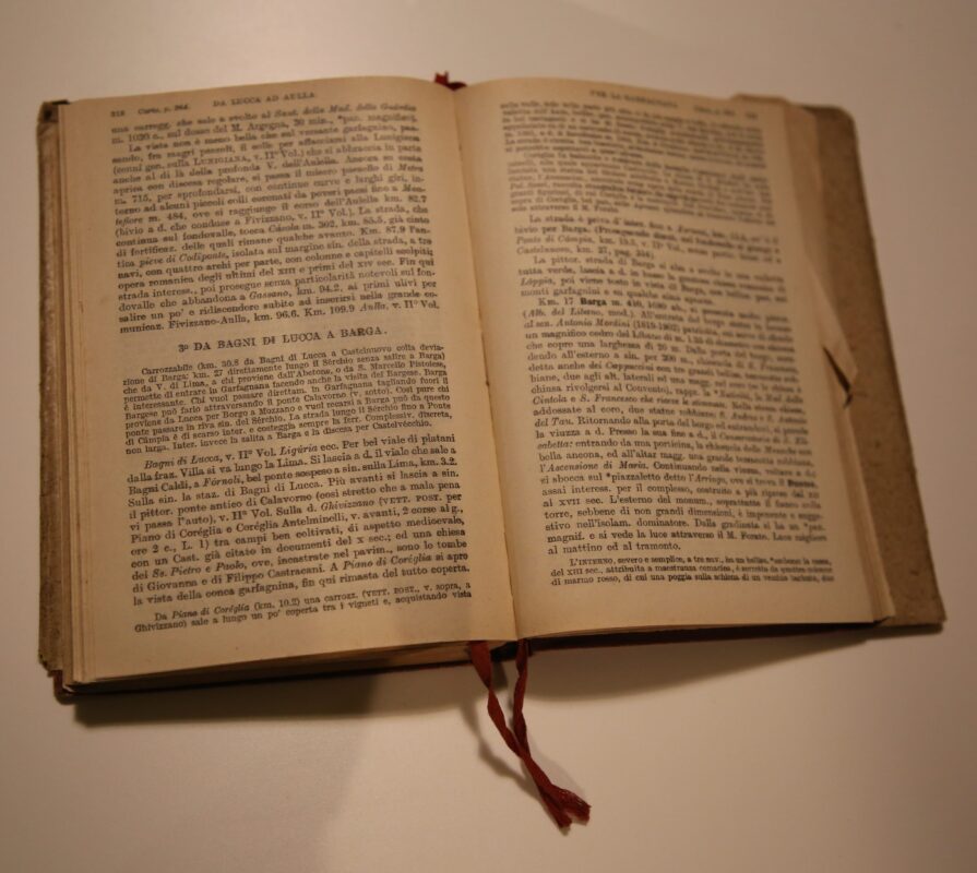 Per avere in lettura una adeguata guida turistica per il nascente XX secolo dove ci si sposta con lo sbuffante treno a vapore, oppure al volante di traballanti e poco sicure automobili, bisogna attendere gli anni 1914-1916 quando il Touring comincia a pubblicare la collana delle Guide d’Italia. I primi quattro volumi riguardano i territori nord occidentali: Piemonte, Lombardia, Liguria, Toscana nord-ovest. Questi volumi vengono stampati in un numero di copie molto elevato (200.000 per ogni volume) e distribuiti gratuitamente ai soci, mentre il loro costo di vendita era di £ 0,65 ciascuno per l’Italia, e £ 1,20 negli stati esteri. La Valle del Serchio e Barga li troviamo descritti nel primo volume, riguardante Liguria e Toscana, da p. 311 a p. 320. Il territorio è visitabile mediante ferrovia corredata da servizio di carrozze postali n partenza da alcune stazioni, oppure con l’utilizzo di automobili che possono raggiungere solo i maggiori centri come Coreglia Antelminelli, Barga, Molazzana. Il ponte di Calavorno nel 1916 aveva un’architettura assai vetusta e si attraversava solo con piccoli carri; anche il transito per le poche auto del “turismo-mobile” era altrettanto arduo (fu poi distrutto dall’esercito tedesco nel 1944; oggi ne resta visibile solo il basamento del pilone centrale e la coscia di appoggio sulla sponda destra). La sponda destra del Serchio, da Borgo a Mozzano a Castelnuovo, era già carrozzabile dal 1812 con il tratto iniziale Borgo – Calavorno meno trafficato, dato che Bagni di Lucca era un bacino di utenza turistica assai rilevante per l’epoca, e da lì passava un discreto numero di carrozze e carri. La direttrice di sponda destra prese il nome di Via Nazionale da Livorno ai confini col Mantovano.