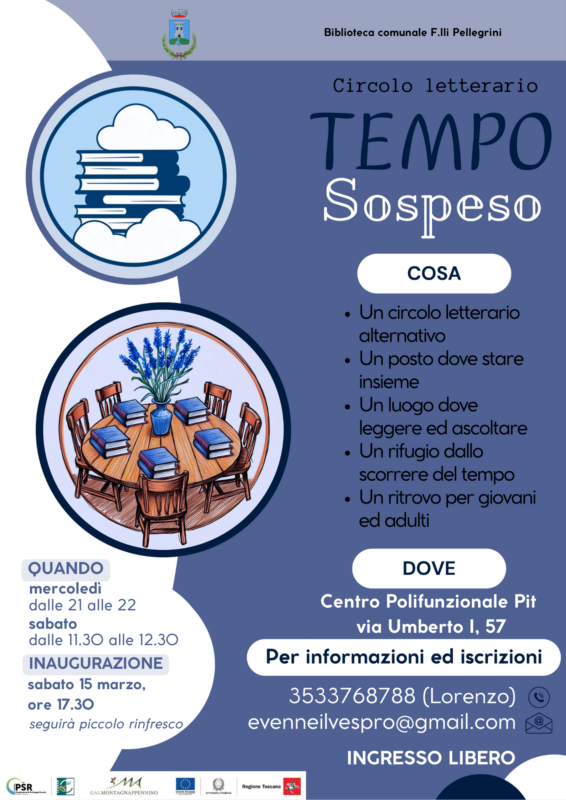 BORGO A MOZZANO – Appuntamento con i libri e la lettura a Borgo a Mozzano. Sabato 15 marzo, alle 17.30, si presenta il circolo letterario “Tempo sospeso”. Proposto dallo scrittore Lorenzo Bellandi, e realizzato con il supporto del Comune di Borgo a Mozzano, il circolo letterario si riunirà all’interno del centro polifunzionale PIT, in via Umberto I, realizzato grazie ai fondi provenienti dal Gal Montagnappennino nell’ambito del progetto “La quadratura del Serchio”.