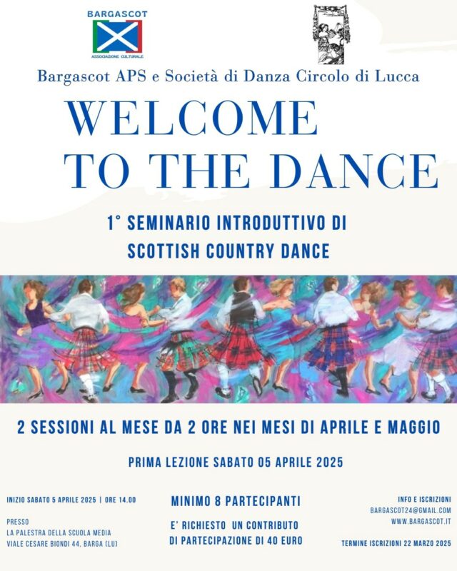 BARGA – Nella città più scozzese di Italia, l’associazione locale Bargascot APS, impegnata alla promozione di iniziative dedicate all’importante rapporto Barga-Scozia, presenta, in collaborazione con la Società di Danza Circolo di Lucca (che ogni anno arricchisce lo Scottish Festival con il loro evento “A Scottish Dance Trip”), il primo seminario introduttivo di Scottish Country Dances “Welcome To The Dance” durante il quale insieme alla docente di danza, verranno studiati le disposizioni, i passi e le figure di base che verranno utilizzati nella realizzazione di alcune danze scelte dal repertorio della Royal Scottish Country Dance Society. Tra queste “Gay Gordons”, “Strip the Willow” o “The Dashing White Sergeant”.