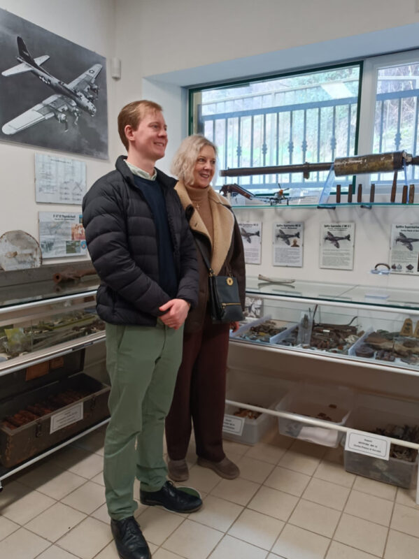 Visita al museo e immancabile commozione davanti ai reperti dello Spitfire del loro congiunto. Scambio di doni e pianificazione di future collaborazioni.