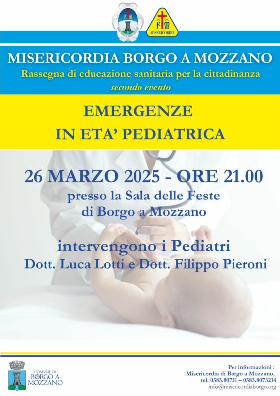 L’incontro, che inizierà alle 21, avrà come tema “Emergenze in età pediatrica” e sarà tenuto dai pediatri dott. Luca Lotti e dott. Filippo Pieroni.