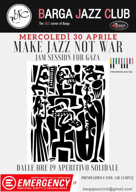 BARGA – “Make jazz, not war”. Si intitola così l’aperitivo in musica che la sera di mercoledì 30 aprile viene organizzato al Barga Jazz Club di Barga in via del Pretorio. Una jam session che ha il principale scopo di raccogliere fondi in favore dell’ospedale di Emergency a Gaza.