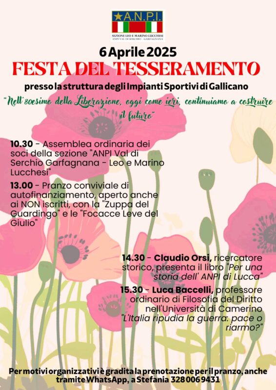 GALLICANO – La sezione ANPI Val di Serchio Garfagnana organizza la propria giornata del Tesseramento per Domenica 6 Aprile a Gallicano presso gli Impianti Sportivi.