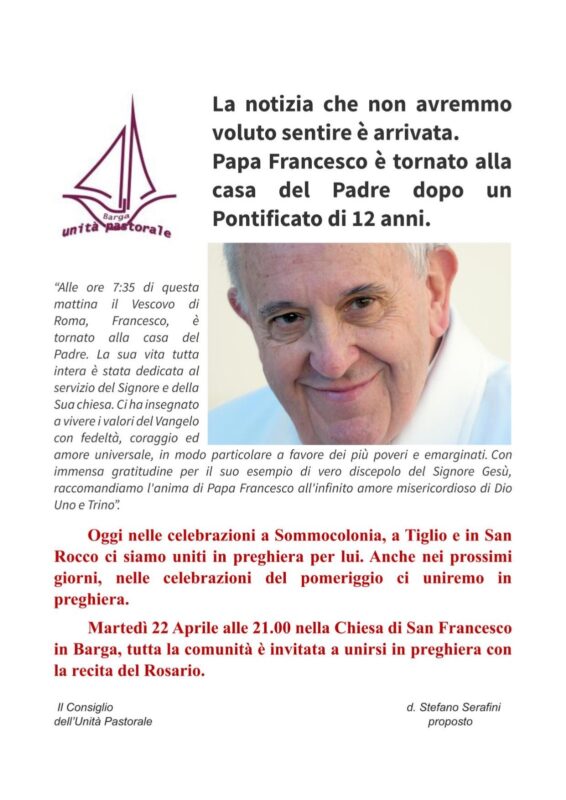BARGA – La notizia della morte di Papa Francesco è stata accolta con dolore e cordoglio anche in tutta la comunità barghigiana. Come ha fatto sapere il proposto di Barga, mons. Stefano Serafini: “oggi abbiamo celebrato le quarantore a Sommocolonia dove abbiamo appreso della scomparsa di Papa Francesco e poi a Tiglio e durante la celebrazione abbiamo pregato anche per Papa Francesco e per don Giuseppino Cola a due anni dalla sua scomparsa.
