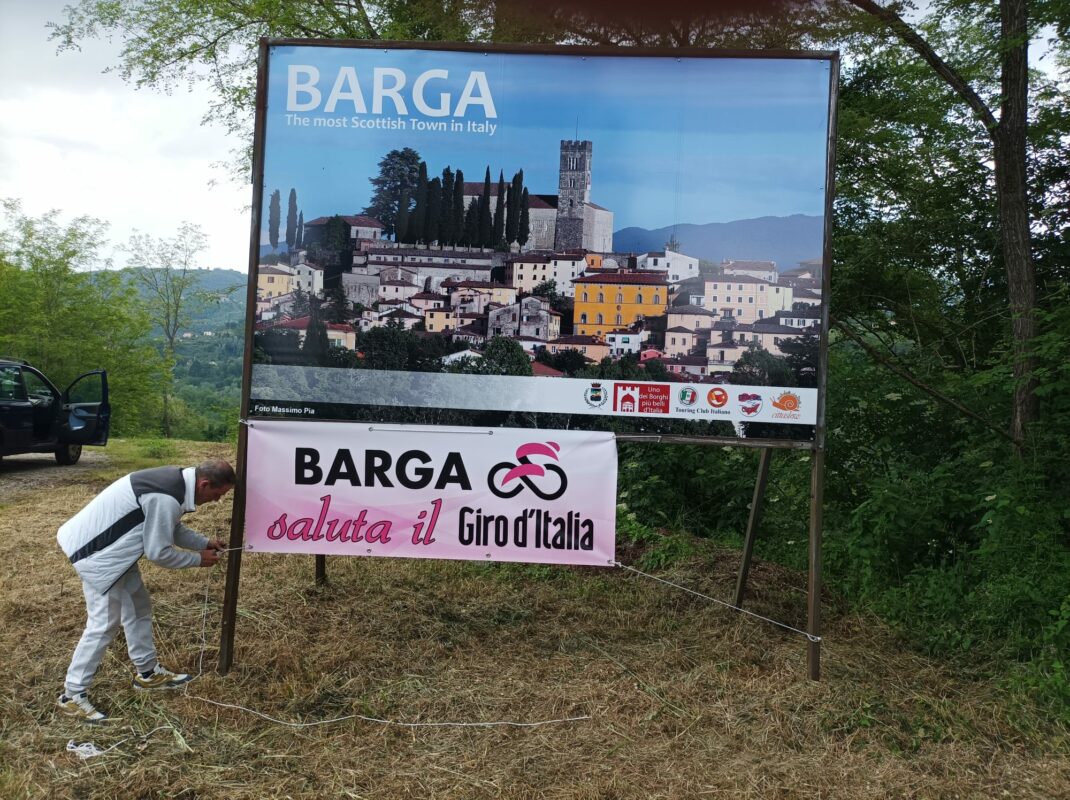 BARGA – Oltre allo striscione che il comune di Barga ha fatto mettere davanti al Belvedere Magri, lungo la circonvallazione di via Marconi ed alle bandiere che ha posto lungo il percorso, per accogliere il Giro d’Italia non sono mancate anche alcune belle e lodevoli iniziative personali. Intanto a Barga da segnalare i belli striscioni che il Bar Sport di Andrea Marroni e la Farmacia Simonini con il vulcanico dottor Enzo Simonini hanno messo in giro. Uno striscione è stato messo al curvone di Loppia, uno alla foto gigante di Barga alle Palmente, un altro al Giardino ed uno infine alla prima curva di via Pascoli, dopo l’agraria.