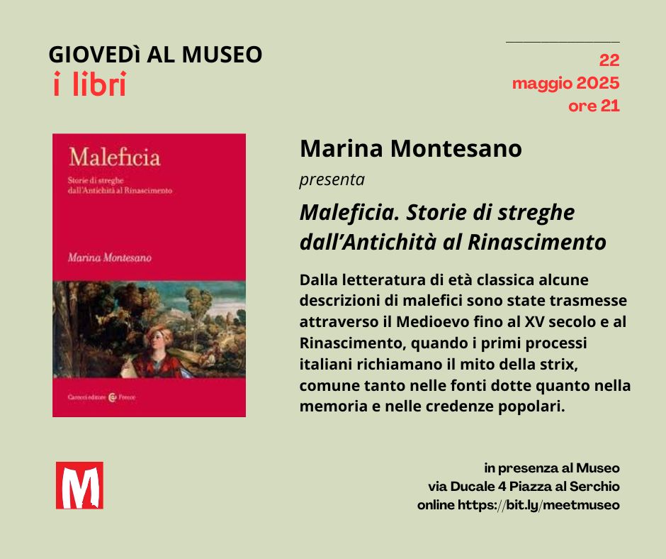 PIAZZA AL SERCHIO – Le streghe sono le protagoniste del prossimo appuntamento dei Giovedì al Museo, il 22 maggio alle ore 21, con la presentazione del volume Maleficia. Storie di streghe dall’Antichità al Rinascimento (Carrocci Editore, 2023), ospite la Professoressa Marina Montesano. È possibile assistere all’incontro sia in presenza, presso la sede del Museo, in Via Ducale 4 a San Michele, che online, prenotandosi al link: https://bit.ly/maggiomuseo25