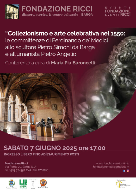 BARGA – Organizzata dalla Fondazione Ricci, con il patrocinio del Comune di Barga, di Unitre Barga e Istituto Storico Lucchese sezione di Barga, con il contributo della Fondazione Cassa di Risparmio di Lucca, si terrà Sabato 7 giugno alle ore 17.00 nella sede della Fondazione Ricci di Barga, la conferenza della dott.ssa Maria Pia Baroncelli dal titolo: Collezionismo e arte celebrativa nel 1550: le committenze di Ferdinando de Medici allo scultore Pietro Simoni da Barga e all’umanista Pietro Angelio.