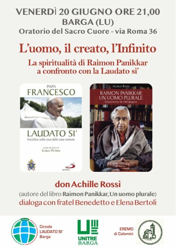 BARGA – Venerdì 20 giugno alle 21 presso l’Oratorio del Sacro Cuore il Circolo Laudato Si’, Unitre Barga e l’Eremo di Calomini propongono la serata “L’uomo, il creato, l’Infinito. La spiritualità di Raimon Panikkar a confronto con la Laudato si’”.