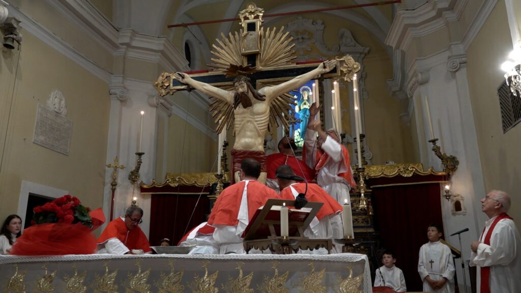 C’è una lunga storia che interessa questa immagine sacra; caratterizzata da avvenimenti documentati e anche fatti non documentati; poi si arriva alla seconda guerra mondiale con il fioretto di 5 soldati, ovvero che se fossero tornati sani e salvi avrebbero portato in giro per il paese il crocifisso; alla fine, con l’aggiunta di altri due paesani così fu e da allora nasce, seppur solo nel secolo scorso, questa tradizione dal forte legame religioso. Ora il paese si è preparato a festa e a segnare l’inizio delle celebrazioni proprio la traslazione dell’antico crocifisso; poi il 25 sera la Via Crucis e domenica 27 la santa messa celebrata dal vescovo Mons Paolo Giulietti, con il grande crocifisso portato in processione con tutto il suo trono. A incorniciare la fine della manifestazione anche i fuochi d’artificio