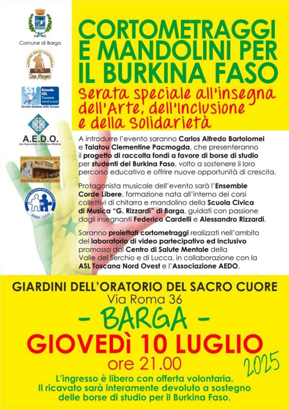Il 10 luglio 2025 alle ore 21, nella suggestiva cornice dei giardini dell’Oratorio Sacro Cuore di Barga, si terrà una serata speciale all’insegna dell’arte, dell’inclusione e della solidarietà: “Cortometraggi e Mandolini per il Burkina Faso”.