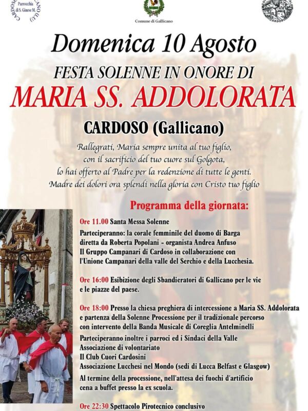 CARDOSO – Cardoso, nel comune di Gallicano, vi aspetta domenica 10 agosto con i solenni festeggiamenti in onore di Maria SS. Addolorata.