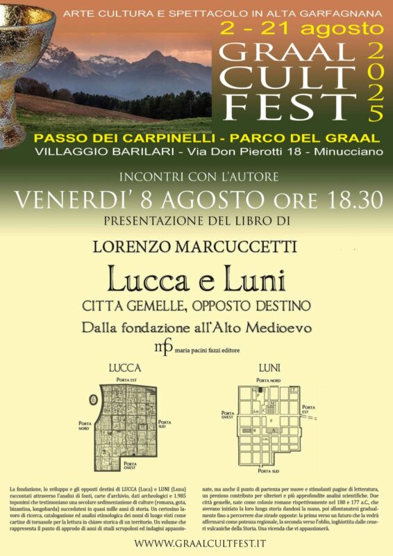 PASSO DEI CARPINELLI – Venerdì 8 agosto ore 18.30 nell’ambito della IV edizione del Graal Cult Festival al Parco Graal via don Pierotti 18 Passo dei Carpinelli Minucciano sul crinale che unisce la Lunigiana e la terra di Luni con la terra di Lucca e la Garfagnana, ci sarà un incontro con lo storico Lorenzo Marcuccetti autore del libro Lucca e Luni Citta Gemell; condurra l’incontro il prof Umberto Bertolini direttore del Museo Italiano dell’Immaginario Folclorico con la partecipazione del prof. Paolo Fantozzi esperto della Storia e delle Tradizioni del territorio lucchese