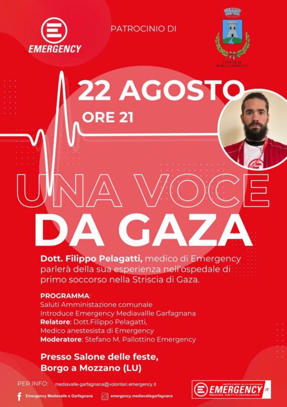 BORGO A MOZZANO – Il gruppo Emergency Mediavalle Garfagnana organizza l’evento “Una Voce da Gaza” che si svolgerà venerdì 22 Agosto alle 21 presso il Salone delle Feste di Borgo a Mozzano.