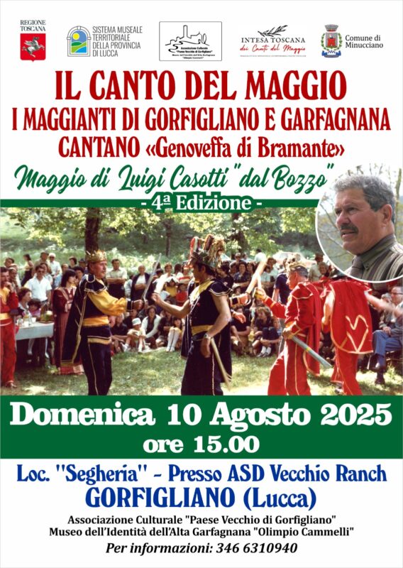 Nel pomeriggio di domenica, a partire dalle 15 in località Segheria, ASD Vecchio Ranch, i Maggianti di Gorfigliano e Garfagnana cantano “Genoveffa di Bramante”, maggio di Luigi Casotti “dal Bozzo”. L’iniziativa è organizzata dall’associazione culturale “Paese Vecchio di Gorfigliano” e dal Museo dell’Identità dell’Alta Garfagnana “Olimpio Cammelli”. Per informazioni: 3466310940.